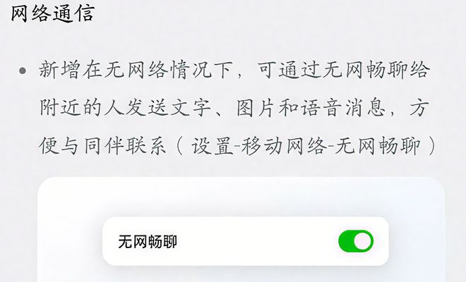 其中,一项原有功能“无网畅聊”得到大幅升级——从原本仅支持无网通话,拓展至可发送文字信息、语音信息乃至图片信息。