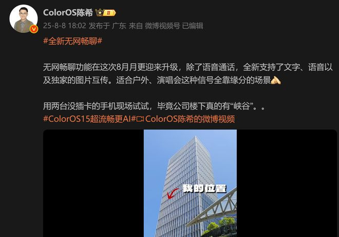 据ColorOS设计总监陈希的演示显示,即便在人员密集、高楼遮挡的办公写字楼周边,该功能也能实现远距离传输。