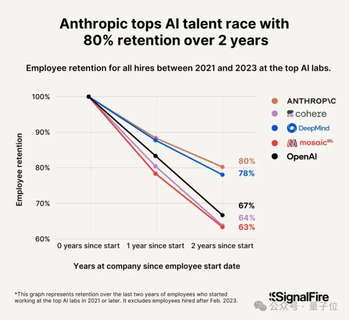 过去两年,坚持不搞天价挖人的Anthropic员工保留率高达80%,而大手笔撒钱的Meta以及OpenAI只有64%。