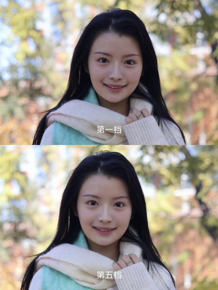 针对人像拍摄,佳能EOS R50在“SCN特殊场景”模式配备了“平滑皮肤”的场景模式。其中,平滑皮肤模式可以支持最高五档的档位调节,让人像皮肤实现不同程度柔和效果,这里我选取了第一档和第五档下所拍摄的照片进行了对比。